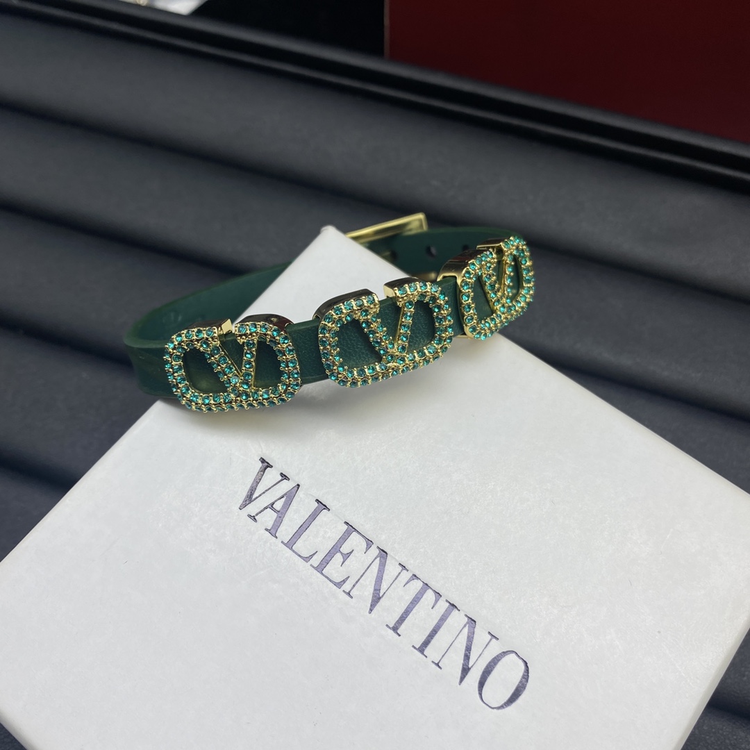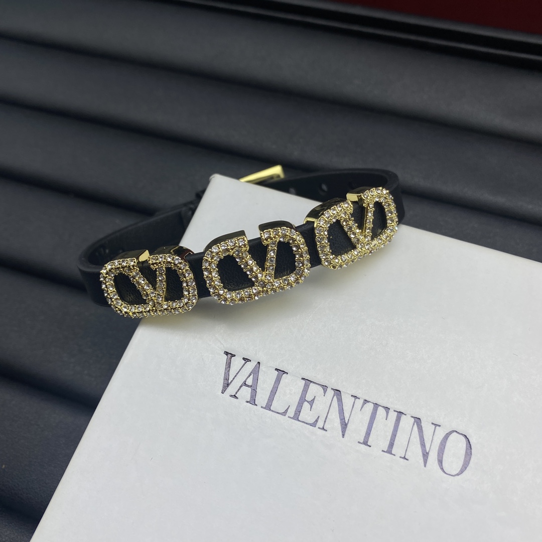 Valentino Jewelry Bracelets Full Diamond Square V Logo Leather Bracelet